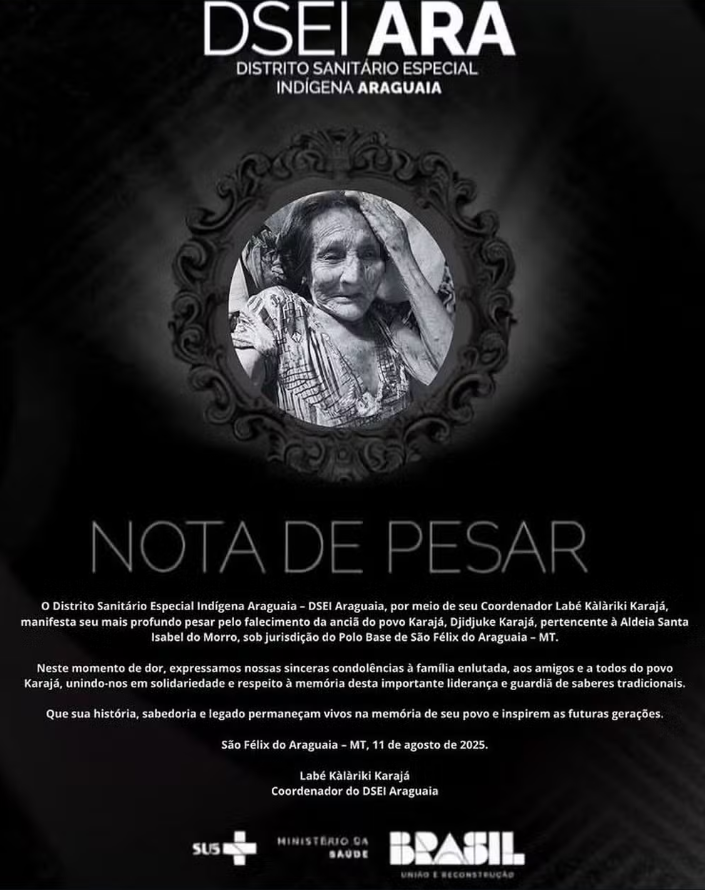 Faleceu no último dia 11 de agosto, aos 100 anos e sete meses, a anciã Djidjuke Karajá, da aldeia Hãwalo, localizada em Santa Isabel do Morro, na Ilha do Bananal (TO). Guardiã dos saberes tradicionais do povo Karajá e referência como pajé desde a infância, Djidjuke ficou conhecida nacionalmente por estampar, ao lado de Koixaru Karajá, uma edição limitada da cédula de 1.000 cruzeiros, lançada em 1990 como forma de homenagem aos povos originários do Brasil.