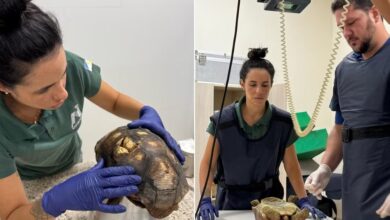 Yasmim Rodrigues/Bastidores do Tocantins O jabuti-piranga encontrado sob o piso de uma residência em Itacajá, no nordeste do Tocantins, foi…