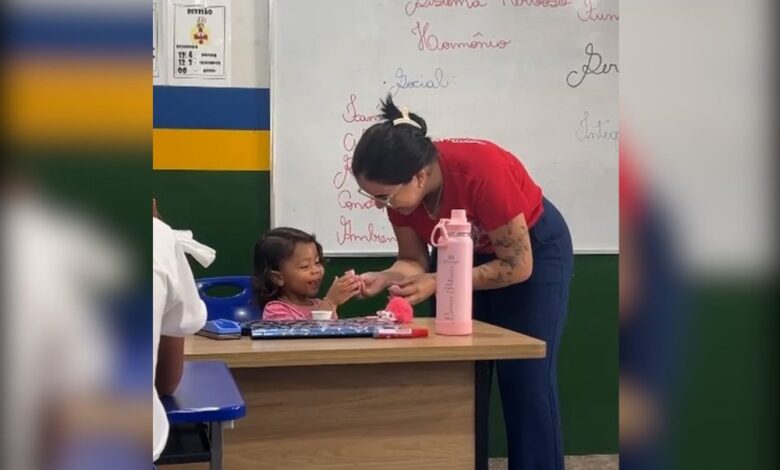 Durante a aula, a educadora segurou a criança no colo enquanto a aluna acompanhava o conteúdo, garantindo que Giovana não fosse prejudicada nos estudos. O momento foi registrado em vídeo e rapidamente viralizou.