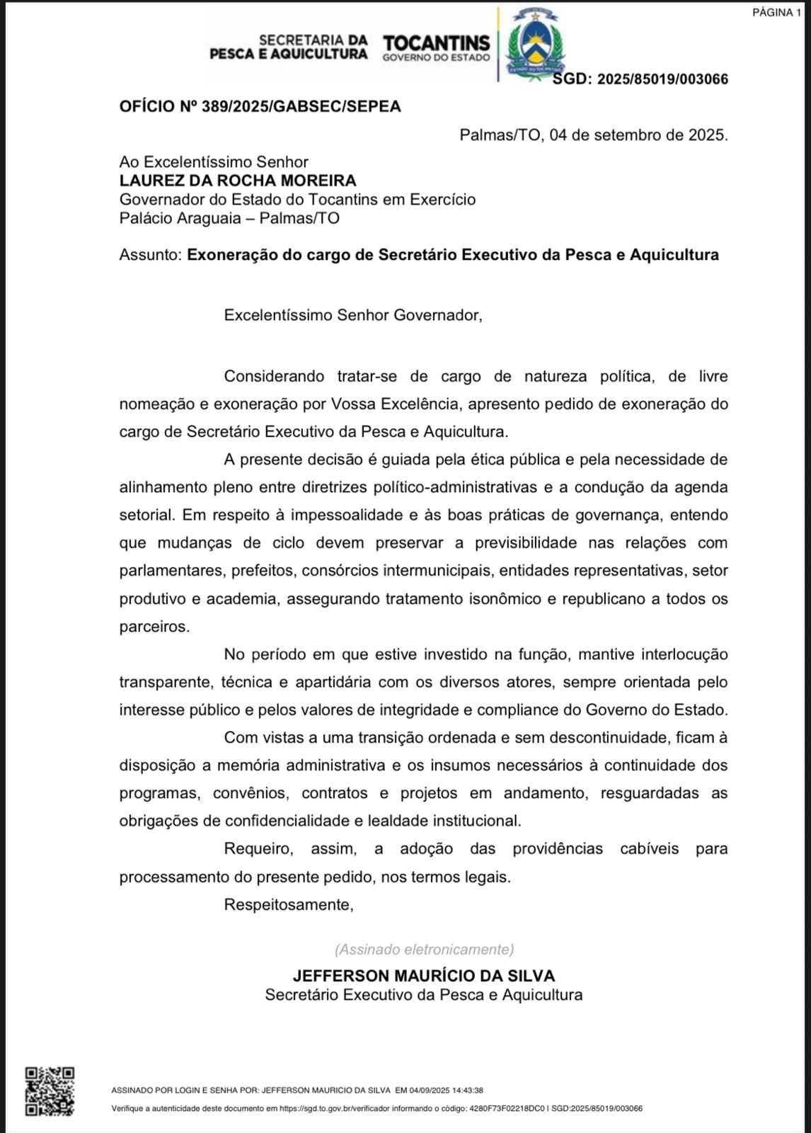 O agora ex-secretário executivo da Pesca e Aquicultura do Tocantins, Jefferson Zêra, protocolou nesta quarta-feira, 4, o pedido de exoneração do cargo que ocupava na estrutura do Governo do Estado. Em nota pública, Zêra destacou que sua decisão foi tomada com responsabilidade, serenidade e espírito de respeito institucional, reconhecendo o caráter político da função.