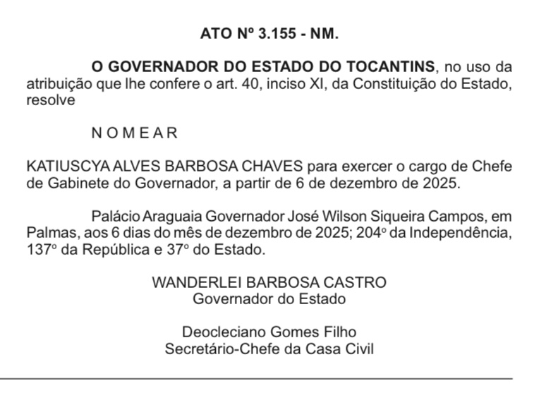 Com a nomeação, o governador Wanderlei Barbosa reforça a confiança na capacidade técnica e política de Kátia Chaves, reconhecida por sua atuação firme, sensibilidade administrativa e pela habilidade em construir diálogo com diferentes setores do Estado.