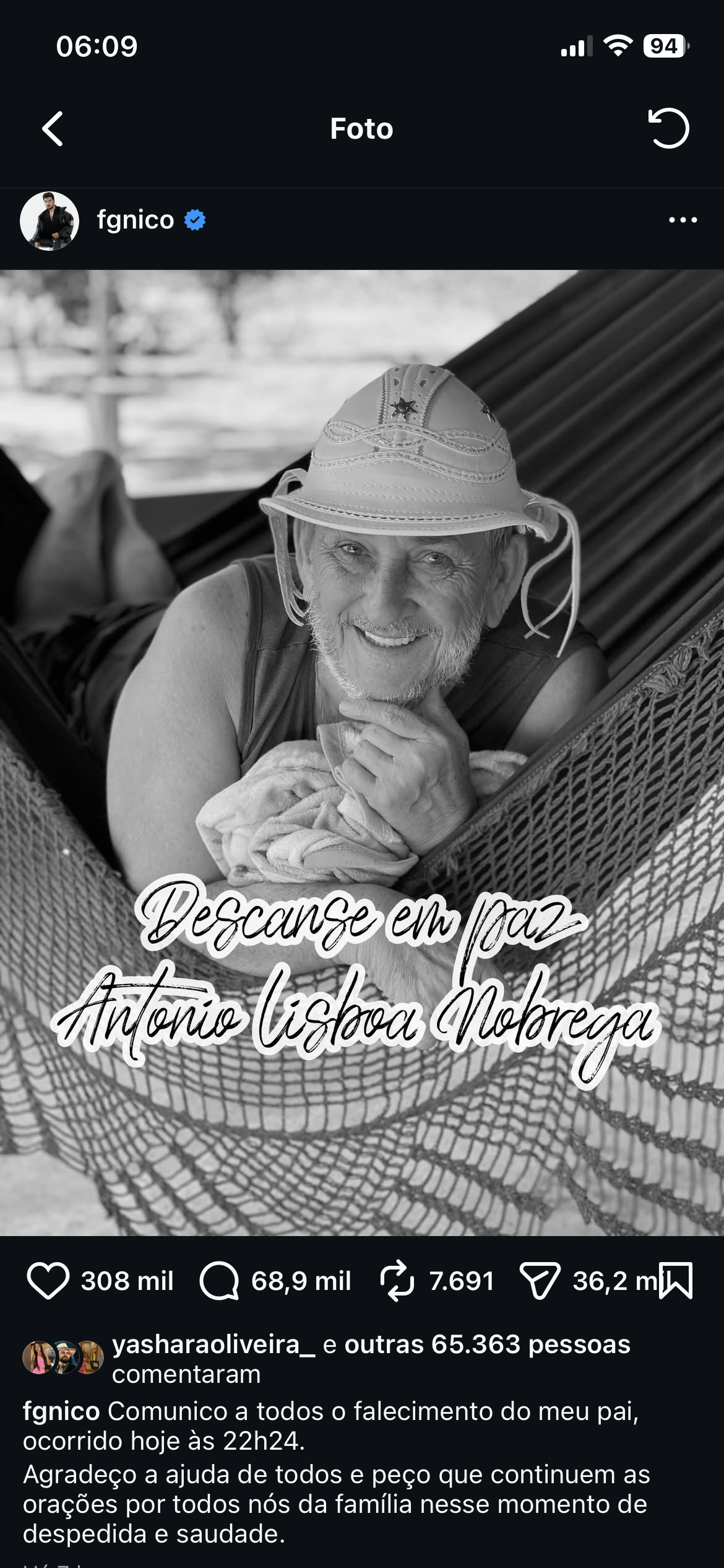 A notícia foi divulgada pelo próprio influenciador por meio de suas redes sociais. Na publicação, FG Nico informou o horário da morte do pai, agradeceu as mensagens de apoio recebidas e pediu que amigos e seguidores continuem em oração pela família neste momento de despedida e saudade.