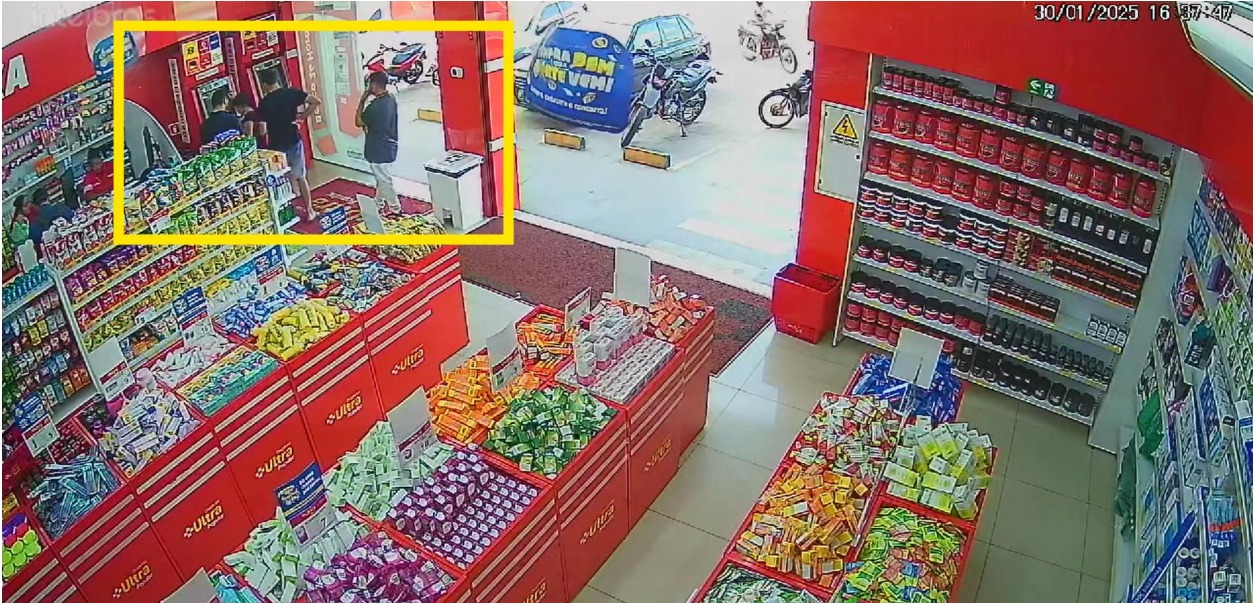 Com o intuito de identificar os golpistas, a Polícia Civil está divulgando as imagens das câmeras de segurança que mostram o momento em que os indivíduos abordam a vítima no caixa eletrônico de uma farmácia e ainda de alguns desses indivíduos dentro de uma agência bancária realizando os saques e as transferências com o cartão da vítima.