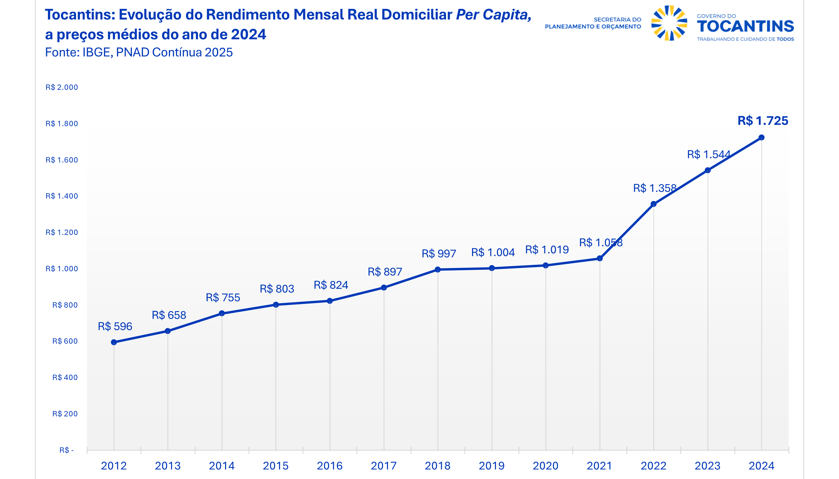 O rendimento médio mensal domiciliar per capita no Tocantins alcançou o maior valor desde o início da série histórica iniciada em 2012, chegando a R$ 1.725 em 2024, um crescimento de 11,72% em relação a 2023. Esse rendimento coloca o estado em 1º lugar no ranking de maior rendimento médio das regiões Norte e Nordeste; e o 13º rendimento do país. Os dados são da Pesquisa Nacional por Amostra de Domicílios Contínua (Pnad Contínua), divulgada pelo Instituto Brasileiro de Geografia e Estatística (IBGE).