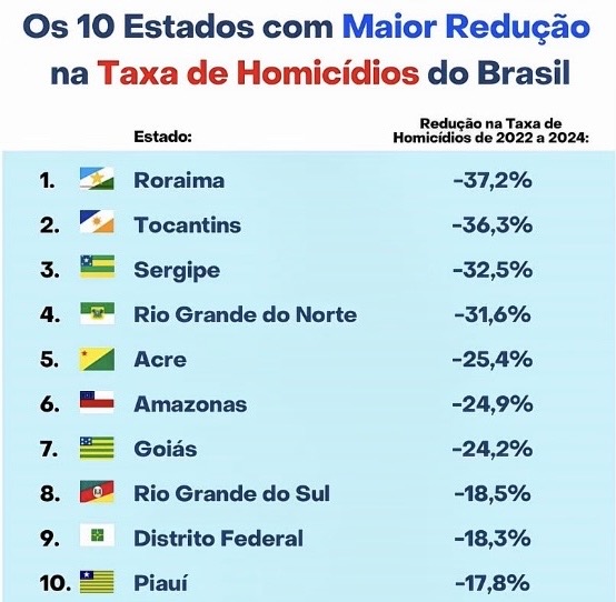 O ranking nacional divulgado aponta ainda que outros estados também registraram reduções significativas, mas o Tocantins chama atenção pelo ritmo acelerado de queda, consolidando-se como referência regional na área de segurança pública.
