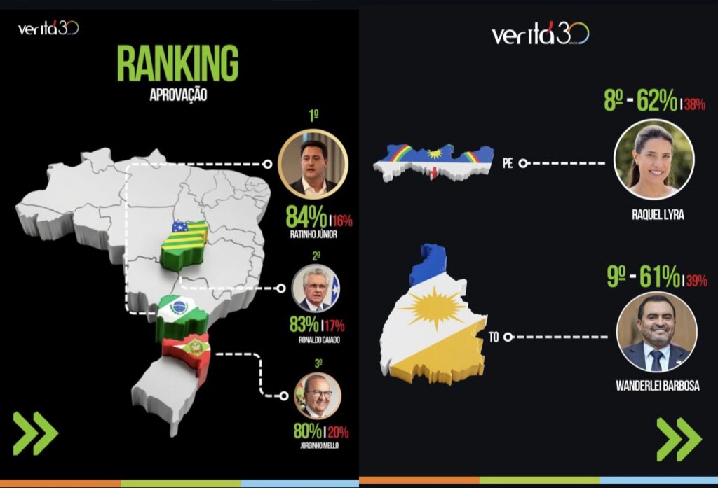 Entre os destaques positivos do levantamento estão os governadores Ratinho Júnior, com 84% de aprovação; Ronaldo Caiado, com 83%; e Jorginho Mello, também entre os mais bem avaliados.